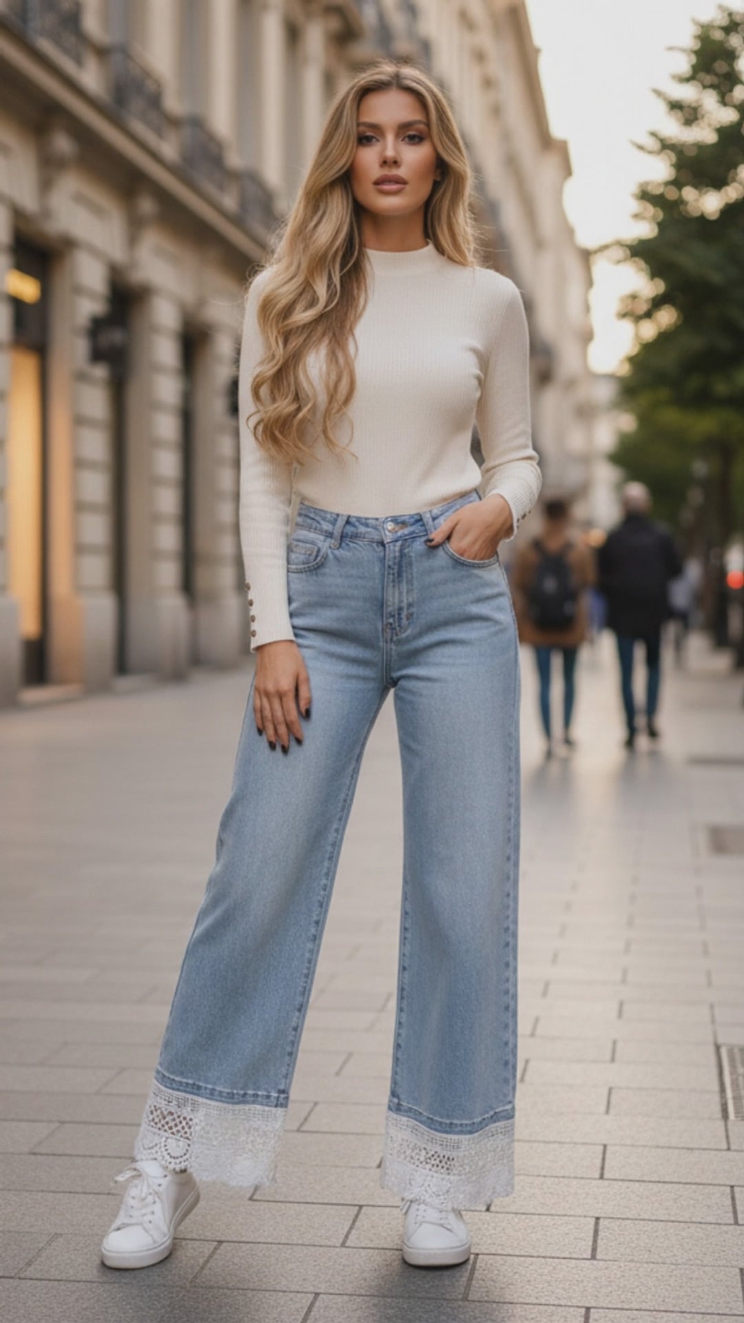 Elasztikus puha farmer anyagból készült madérás csipkével díszített farmernagdrág.